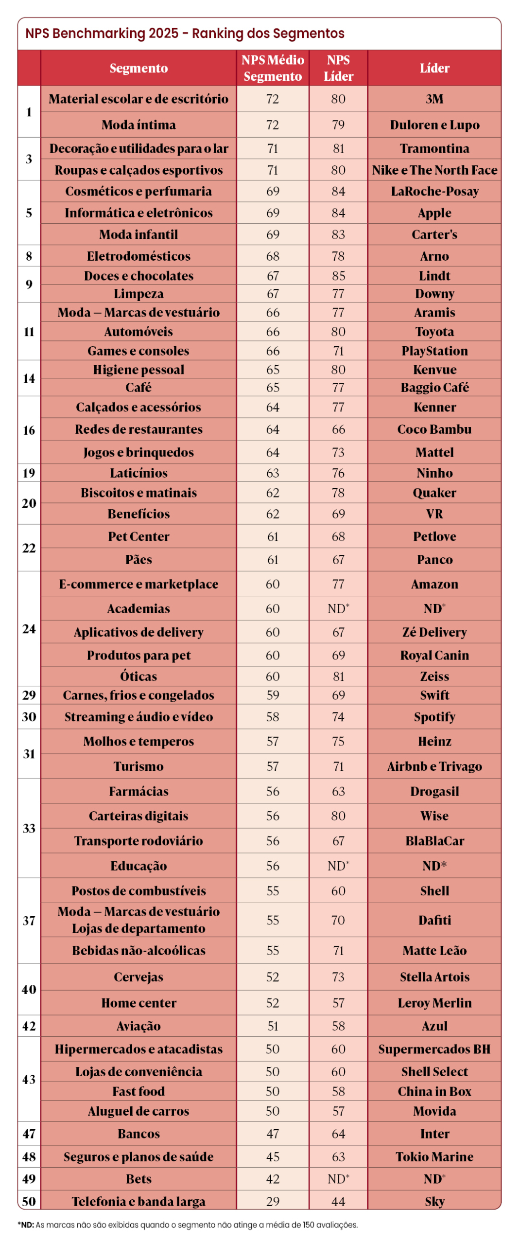 Confira o ranking das 50 marcas do NPS Benchmarking 2025: