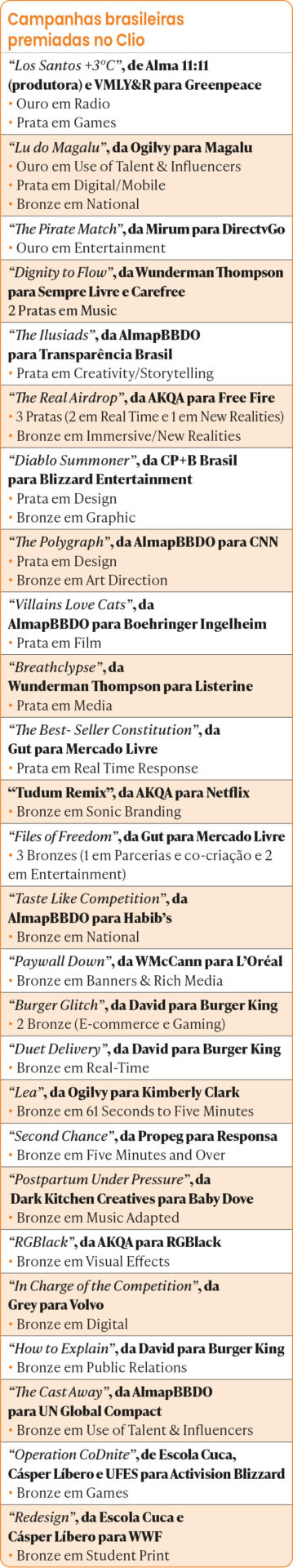 Com seis troféus cada, AKQA e AlmapBBDO foram as agências brasileiras mais premiadas no Clio Awards 2023. As campanhas criadas para Free Fire, RGBlack e Netflix renderam à AKQA troféus de Prata e Bronze. Já a Almap ganhou Bronzes com trabalhos feitos para como CNN e Habib’s.