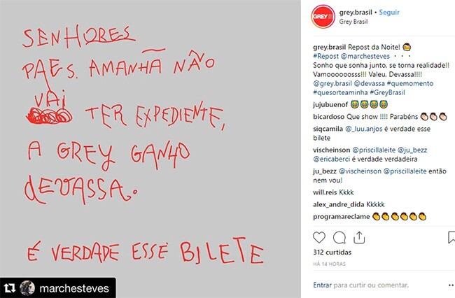 Nessa terça-feira, 4, foi a vez da Grey brindar a conquista da Devassa, outra marca do portfólio da Heineken no Brasil, em uma concorrência feita em paralelo a de Schin. Com a bebida, a Grey também entra na seara das agências com marcas de cerveja no portfólio. Para anunciar a conquista, a agência usou seu Instagram para repostar uma imagem publicada pela presidente da operação, Marcia Esteves, que aproveitou o meme do “bilete” para divulgar a novidade. Veja: