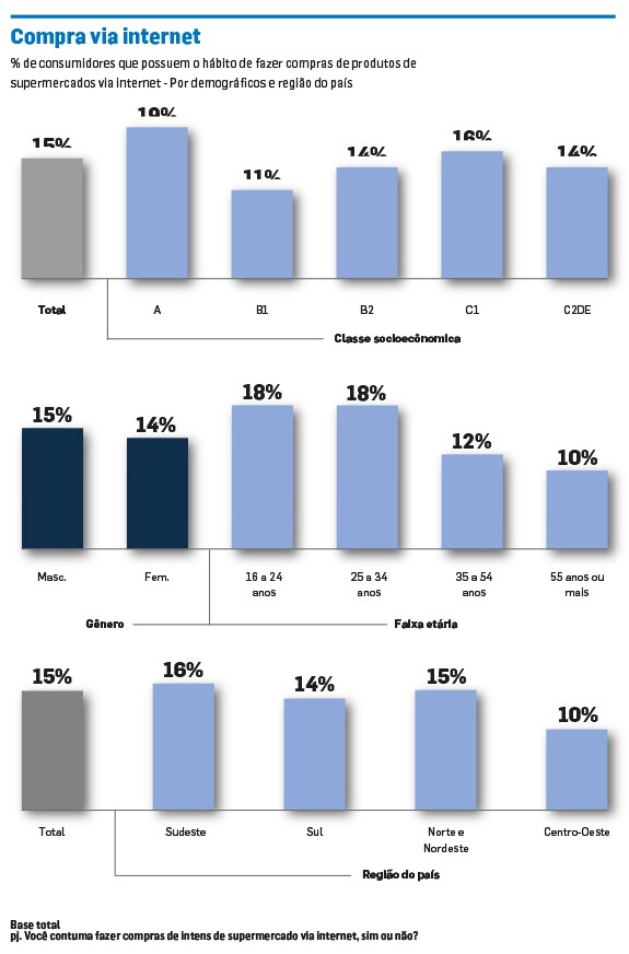 O universo de consumidores brasileiros que compram itens de supermercado pela internet é de 15%, sendo que a classe que mais compra desta forma é a A (19%) e a que menos compra é a B1 (11%). Os jovens de 16 a 24 anos são a faixa etária mais assídua neste canal (18%) e as pessoas com mais de 55 anos, a menos (10%). Já a região que mais utiliza esse método de compra é a Sudeste (16%) e a que menos utiliza é a Centro-Oeste (10%). A constatação é de um estudo de abrangência nacional, da Associação Paulista de Supermercados (Apas), por meio do Painel Conecta do Ibope Inteligência.