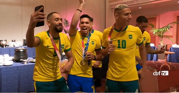 Seleção olímpica comemora a medalha de ouro conquistada nos Jogos de Tóquio (Reprodução/CBF TV)
