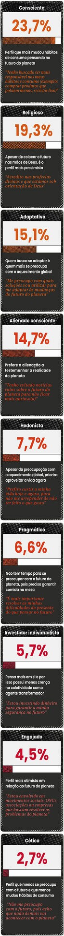 O quarto perfil é o dos alienados conscientes, que correspondem por 14,7% dos respondentes. Esse grupo, baseado no pessimismo, evita confrontar notícias e informações sobre o futuro do planeta para se sentir menos ansioso. Com 7,7%, estão os hedonistas que priorizam viver o momento presente. É o perfil com maior representatividade de jovens entre 18 e 24 anos. Aparecem na pesquisa, ainda, os perfis pragmático, investidor individualista, engajado e cético. Confira: