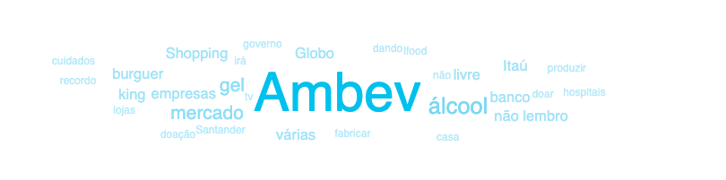 Quando a pergunta é sobre lembrança de marcas, 64% apontam que lembram de uma marca associada ao tema nos últimos dias. Em primeiro lugar aparece a Ambev que nesta terça-feira, 17, anunciou se mobilizou para produzir 500 mil unidades de garrafas de álcool gel na cervejaria localizada em Piraí, no Rio de Janeiro. O produto é destinado aos hospitais públicos nos municípios de São Paulo, Rio de Janeiro e Brasília, onde se concentra a maioria dos casos da doença até o momento. “A empresa resolveu fazer medidas efetivas para ajudar sistema público de saúde”, diz um dos respondentes. Para outra participante, “a ação deve servir de exemplo para outras marcas”.