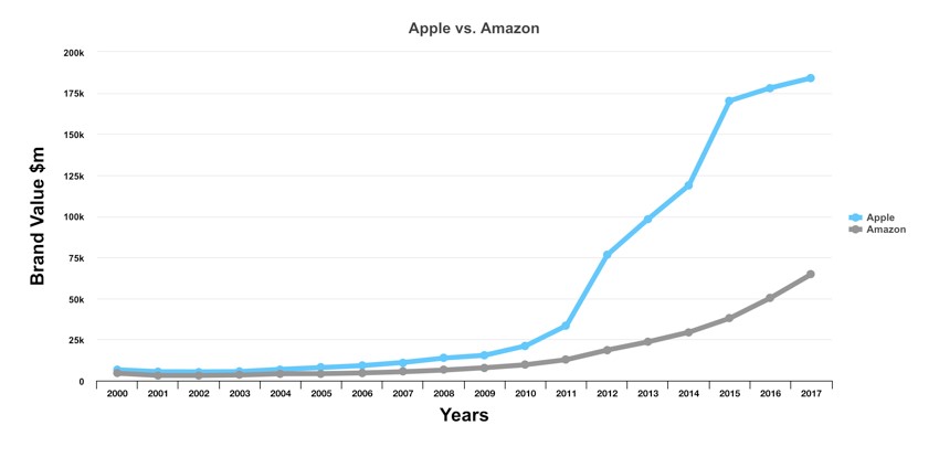 Neste gráfico, desenvolvido pela Interbrand, a evolução de Apple e Amazon em valor de marca nos últimos dezessete anos.