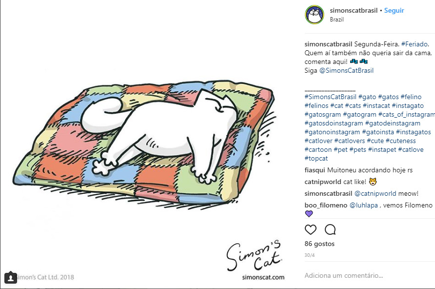 O primeiro passo do felino no mercado brasileiro foi a criação de um perfil no Instagram, com conteúdo em português, que apresenta os personagens e convida o público a compartilhar fotos de seus bichinhos. “Queremos criar uma comunidade em torno dos fãs de gatos, que são nosso público-alvo. Sabemos que a animação também tem um apelo infantil, mas nosso público-alvo são os adultos que se identificam com as histórias por também terem um gato em casa”, aposta Alan Lico, diretor de digital e branded content da Endemol.