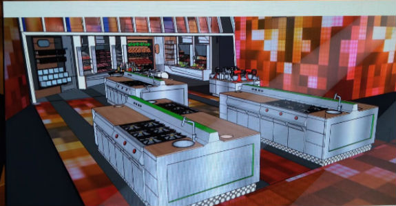 Projeto da cozinha da atração. Bancadas terão luzes de LED que mudam de cor para indicar o tempo que o participante ainda tem para concluir a prova; segundo Boninho, ideia é ter menos pressão (Crédito: Bárbara Sacchitiello)