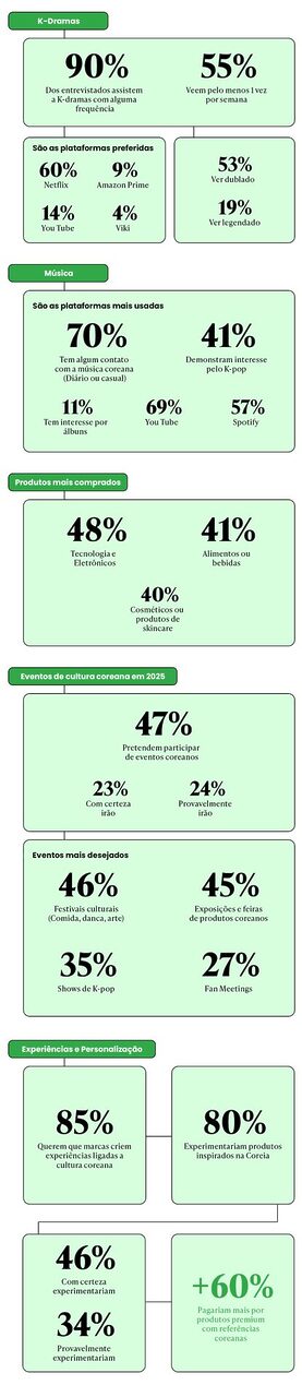Além de itens de consumo, a pesquisa indica que o público está em busca de novas experiências envolvendo essa cultura, uma vez que 85% dos respondentes consideram interessante que marcas criem experiências relacionadas à cultura coreana para promover seus produtos e serviços.