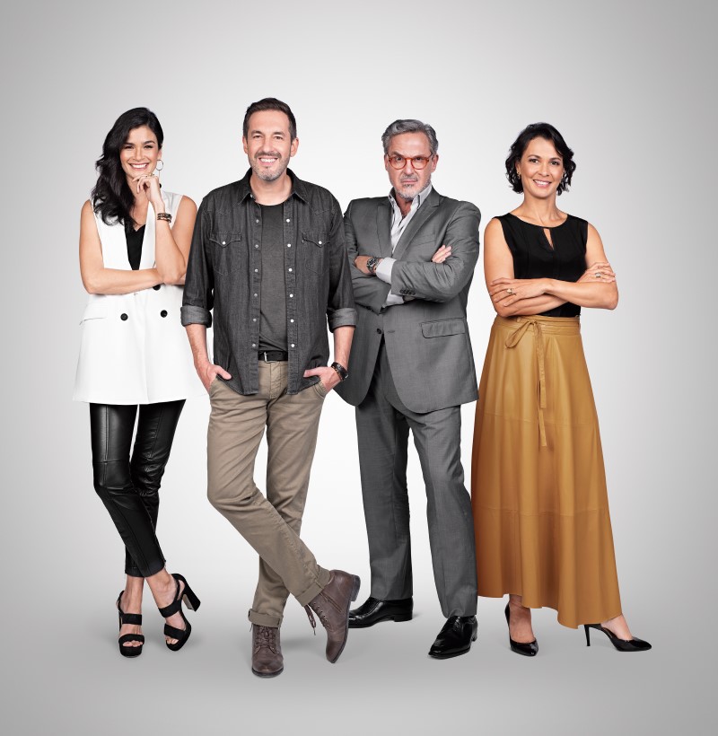 1 por Todos: Carol Ribeiro, apresentadora; Alê Costa, mentor; Fabrizio Fasano e Mônica Burgos, jurados (Crédito: Divulgação)