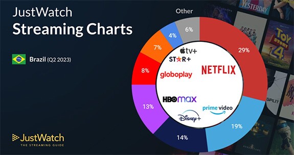 Uma nova edição de um estudo da plataforma Just Watch identificou, entre os subscription based video on demand (SVODs), que a Netflix tem 29% do market share no Brasil.