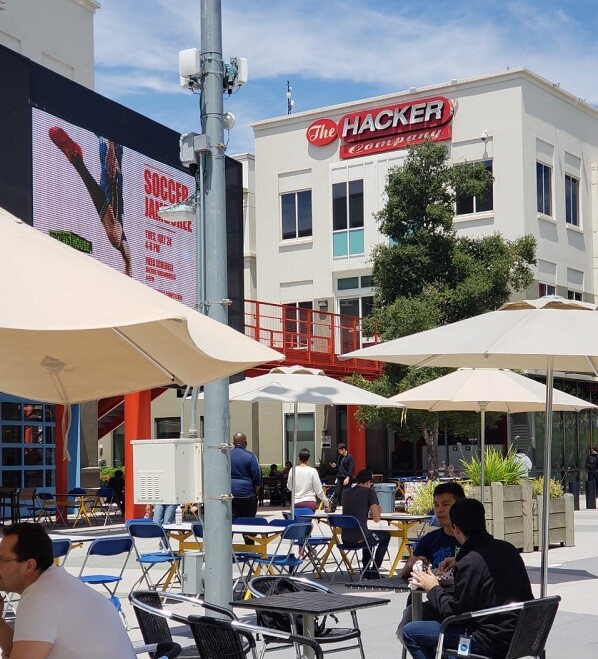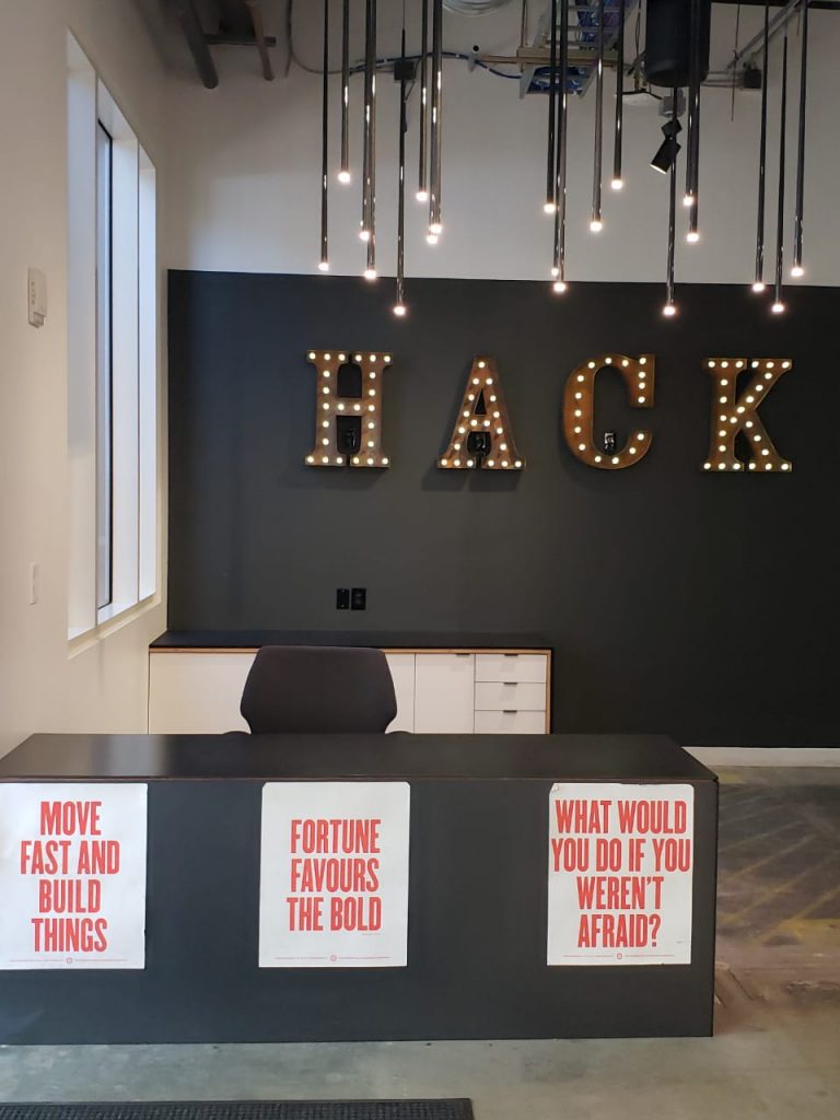 Na foto, a placa com a frase “The Hacker Company” é uma réplica de uma placa encontrada na estrada pelos fundadores do Facebook, nos primeiros anos de atuação da plataforma (Crédito: Karina Balan Julio)