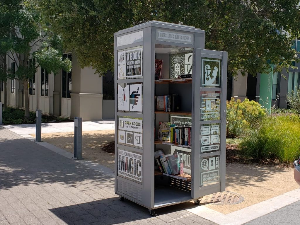 Ao longo do caminho entre edifícios, há cabines para doação e empréstimo de livros (Crédito: Karina Balan Julio)