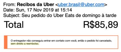 E se o entregador come a refeição e não entrega? O que acontece? Aparentemente, nada. Outro dia, fiz um pedido no Uber Eats que nunca chegou. Quando fiz a reclamação, esta foi a resposta: