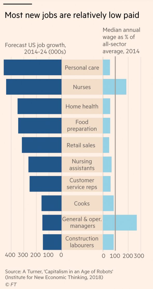 Lord Turner argues that what is happening also explains the “productivity paradox” — rapid innovation, but low productivity growth — that I discussed two weeks ago. A big part of the explanation may be a shift from relatively high-paid jobs in sectors with relatively fast productivity growth, such as manufacturing, towards relatively low-paid jobs in sectors with low productivity growth, such as personal care, home health aides and retail sales. Of the 10 US sectors with the biggest forecast growth in employment between 2014 and 2024, which are expected to generate 29 per cent of all new jobs, eight have median wages below the national median. This, of course, would worsen inequality, and would have strongly negative implications for overall productivity. (See charts.)