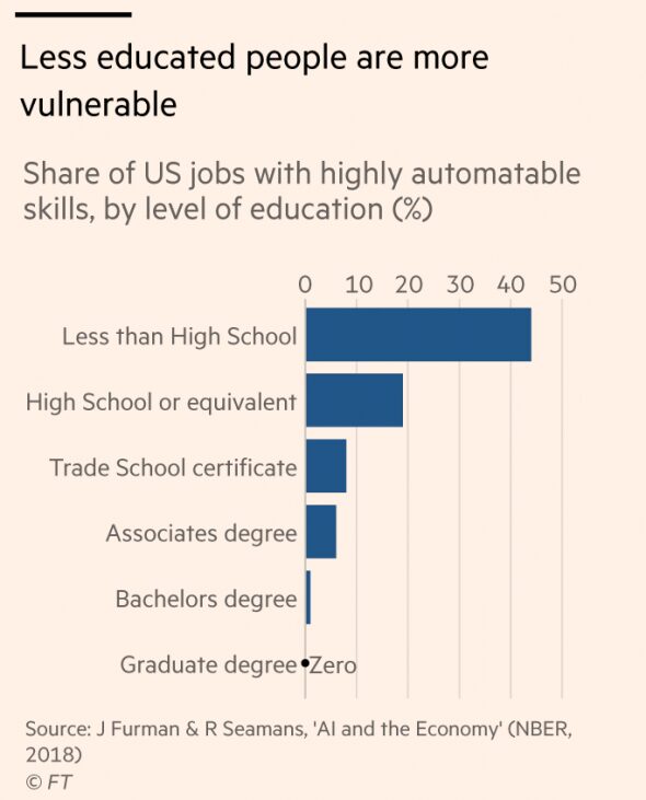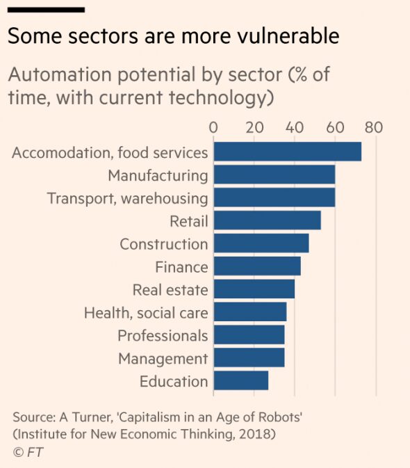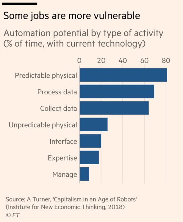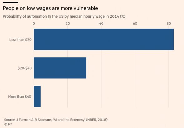 With current technology, predictable physical tasks and collecting and processing of data will be especially vulnerable. By sector, “accommodation and food services”, manufacturing and transportation will be particularly vulnerable. According to a paper by Jason Furman, former chairman of the US Council of Economic Advisers, and Robert Seamans of the Stern School of Business, those who earn less and those with less education are more vulnerable.