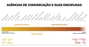 Enfim, a ilustração a seguir mostra, numa espécie de linha do tempo, as disciplinas e especialidades de comunicação e tecnologia que as marcas precisam desenvolver, e onde cada tipo de agência geralmente atua dentro destas disciplinas – considerando apenas as off-line, digitais e de performance.