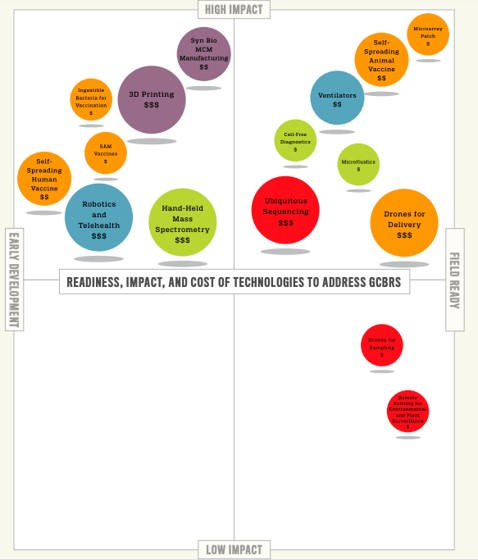 O estudo divide as tecnologias em grupos: o primeiro é detecção e vigilância sanitária; o segundo compreende os aparelhos para diagnóstico de doenças infecciosas; o terceiro reúne as soluções capazes de fabricar as contramedidas médicas; um quarto agrega os métodos de fornecimento e administração de vacinas e medicamentos; e finalmente, aquelas dedicadas aos cuidados clínicos e cirúrgicos.