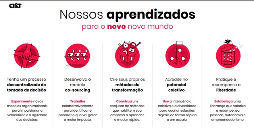 Em sua plataforma CI&T Learnings, a companhia propõem um mapa para os negócios de agora em diante, que se baseia em descentralização, co-sourcing, transformação, coletivo e liberdade.