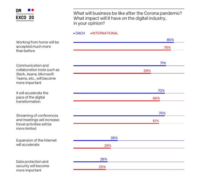 For the long term, however, an optimistic picture emerges. For instance, most respondents (70% nationally, 66% internationally) expect the digital economy to benefit from the pandemic, with the digital transformation accelerating as a result. This is the conclusion of the current DMEXCO Trend Survey with 527 national and 305 international respondents from the DMEXCO community. Although the economic situation of these enterprises is impaired, just 19 percent of respondents from the DMEXCO community in Germany are worried about their jobs at the moment (25 percent internationally). The coronavirus will accelerate the pace of the digital transformation 94 percent of the international respondents and 78 percent of survey participants in the digital sector in Germany are currently working entirely from home. The DMEXCO community expects this to remain the case in the future. The majority of respondents assume that working from home will retain much greater acceptance in the future (nationally: 85 percent, internationally: 78 percent). The communication and collaboration tools now increasingly used in the crisis are also gaining in lasting importance (nationally: 71 percent, internationally: 59 percent). The DMEXCO community is agreed on another central point as well: The coronavirus pandemic will accelerate the pace of the digital transformation, according to 70 percent of German and 66 percent of international respondents. Event cancellations are having a particular impact on the digital sector: 56 percent of German respondents identified “strong or very strong effects”, compared to 64 percent internationally. Dr. Dominik Matyka, Chief Advisor at DMEXCO, sums it up: “As our current Trend Survey shows, the current situation is having different impacts on the digital sector: Budgets will be cut in the short term, and the economy will suffer. On the other hand, companies in the digital sector are becoming increasingly important to the effort to provide the necessary tools and technologies for remote collaboration. The current constraints forcing us to work from home, with video calls and collaboration tools, are also an opportunity to gain in-depth insights into the benefits of digitalization. This is going to significantly accelerate the pace of the digital transformation in the post-coronavirus era.” Christoph Menke, Director Sales & Operations DMEXCO, adds: “Trade fairs rank among the main drivers of the digital economy. As we can already see, canceling key events is having a profound impact on our industry’s business. We are therefore continuing the preparations for DMEXCO in September with great optimism. Nevertheless, we constantly assess the situation, because the safety and health of our visitors and exhibitors is of course our top priority. We will inform our community about any developments as early as possible.”