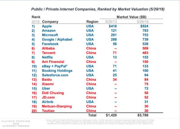Mas o jogo vem mudando rapidamente nos últimos anos com os pesados incentivos do governo chinês ao desenvolvimento de tecnologias em diversas áreas e, em paralelo, a restrição ao acesso a Internet mundial. A proibição imposta por Jinping acabou por fortalecer a indústria digital local. Hoje, 9 das maiores empresas de tecnologia do mundo são chinesas e as demais são todas americanas, sendo 3 asiáticas entre as Top 10, de acordo com o último estudo Internet Trends 2018 da Mary Meekers – Alibaba (6a), Tencent (7a), Ant Financial (9a), Baidu (13a), Xiaomi (14a), Didi Chuxing (16a), JD.com (17a), Meituan-Dianping (19a) e Toutiao (20a).