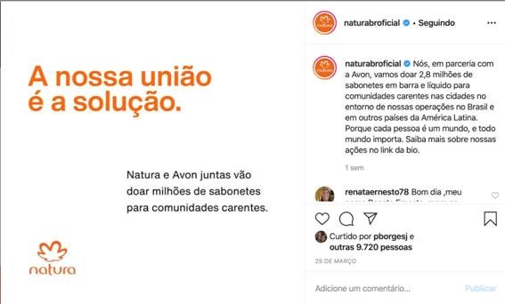 Quarta maior empresa de produtos de beleza do mundo após comprar a rival Avon Products no ano passado, a Natura anunciou a conversão temporária de todas as suas linhas de produção de maquiagem e perfumaria na América Latina para a fabricação apenas de itens de higiene pessoal, incluindo álcool gel e líquido, ajudando a suprir a demanda emergencial do momento.