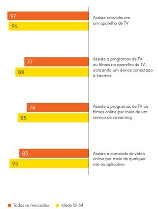 E esta não é uma atividade ocasional. Nos oito países pesquisados, 77% dizem assistir TV em um aparelho de TV pelo menos uma vez por dia. Embora esse número diminua na faixa etária de 18 a 34 anos, ele ainda é alto, com 66%. Enquanto isso, 77% consomem conteúdo por meio de device conectado à TV, e 83% (chegando a 95% na faixa de 18 a 34 anos) fazem isso por meio de um site ou aplicativo.