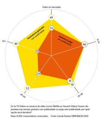 O Dimension revela que, ao contrário do consumo de serviços por assinatura, a inclinação do consumidor para modelos financiados por anúncios varia muito por idade. O grupo de pessoas mais jovens é dividido igualmente entre as duas opções, enquanto pessoas mais velhas preferem um serviço financiado por anúncio, o que talvez reflita o modelo com o qual cresceram.