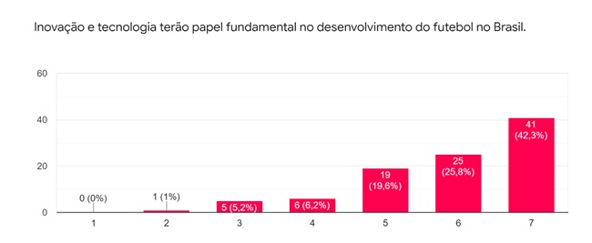 Sobre o papel da inovação e da tecnologia no desenvolvimento do futebol brasileiro, 41% entendem que será vital considerando 7 como a maior escala.
