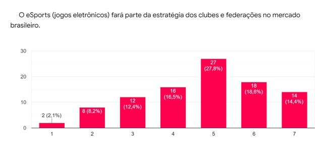 Os e-sports, ou jogos eletrônicos aparecem como destaque quando a pergunta é o aumento da presença dos games na estratégia dos clubes e federações a escala 5 e 14% na escala 7.