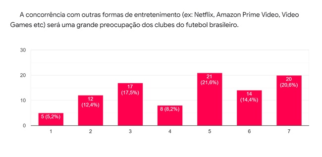 Quando questionados sobre a tendência da gestão do futebol como entretenimento, 29% reforçam que é uma grande possibilidade na escala 5 e 13% na escala 7.
