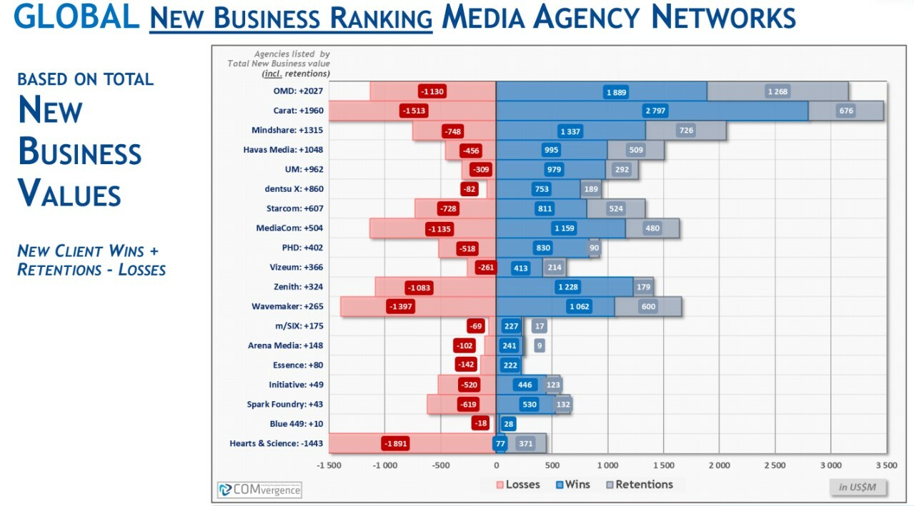 Olivier Gauthier, fundador e CEO da COMvergence, explicou que os resultados gerais foram muito influenciados pelo resultado dos dois maiores pitches do ano passado: P&G da Carat, que ganhou 80% do gasto total de NA de US $ 2,5 bilhões e a conta de US $ 2 bilhões da Disney dividida entre OMD e Zenith.