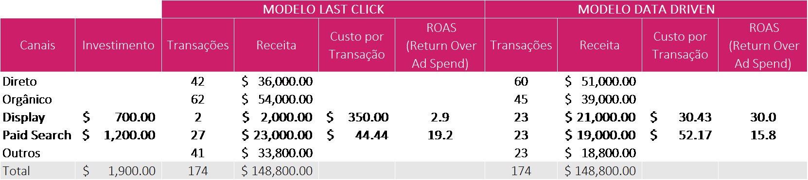 – o ROAS de Display fica abaixo de Paid Search. Neste caso, é normal gerar um estranhamento, mas, ao pensarmos em uma geladeira, será que realmente foi o link patrocinado que mais contribuiu para a venda?