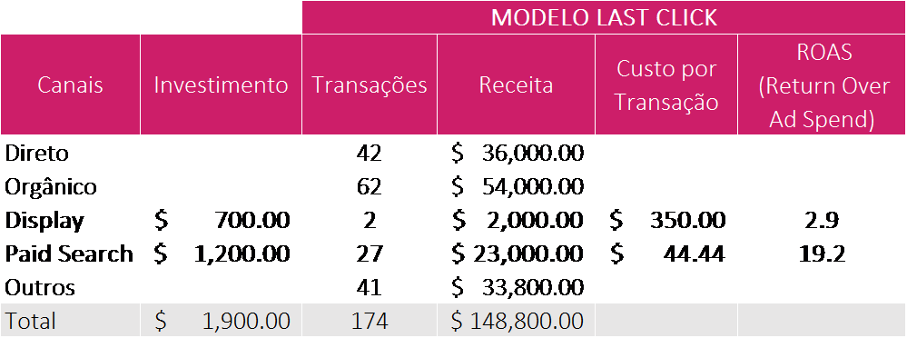 A vantagem deste modelo é que a atribuição é muito simples e direta. Por exemplo, fica muito fácil explicar que investimos R$ 100,00 no buscador em palavras-chaves associadas ao nosso produto e que, com isso, tivemos 10 transações, equivalentes a R$ 10.000,00 de Receita, ou seja, pelo Last Click, o custo de aquisição foi de R$ 10,00 por transação ou um ROAS de 1.000.