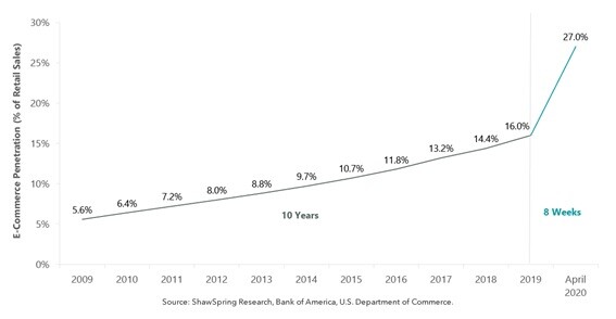 Já está definida qual será a imagem que mais aparecerá em apresentações sobre a aceleração do digital durante a pandemia. Imagino que você já tenha sido impactado por um (ou vários) posts com um gráfico apontando que o e-commerce nos EUA cresceu em 8 semanas de 2020 o mesmo que nos últimos 10 anos.