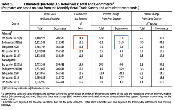 Outro dado que foi convenientemente esquecido é o fato de que, especialmente em Q2, a COVID-19 bateu de frente com nossa realidade de mundo e a maioria dos varejistas teve de baixar as portas de suas lojas físicas. O que aconteceu foi uma queda de USD 105 bi em receitas no varejo físico quando comparado com Q1 de 2020 e USD 115 bi em relação ao mesmo período de 2019, o que representa uma retração de 9,4%. Apenas para efeito de comparação, essa queda no varejo físico significa 54% de todo e-commerce nos EUA. Estes dados estão disponíveis no site do próprio U.S. Department of Commerce. Só dá um pouco de trabalho e Excel para fazer as contas.