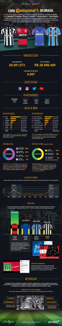 Com a Copa do Brasil como porta de entrada para o mercado brasileiro, a Gum Gum, empresa de inteligência artificial, em parceria com a Ativa Esporte, consultoria criativa para marcas interessadas em associar-se ao segmento esportivo, lançou o piloto de uma tecnologia capaz de medir o número de aparições das marcas em redes sociais durante um jogo.