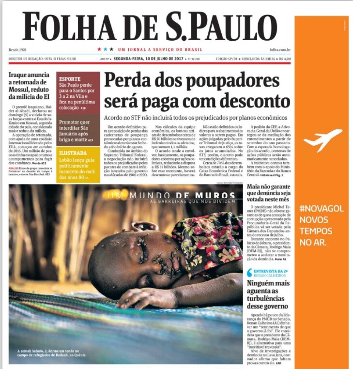 As edições de Folha de S.Paulo desta segunda-feira, 10, estão mais largas no Primeiro Caderno. A alteração no tamanho do jornal faz parte de uma ação em parceria com a Gol com o objetivo de ressaltar o espaço das aeronaves da companhia. Além do anúncio, a campanha contempla uma distribuição especial para os passageiros da Gol e em pontos estratégicos para a empresa.