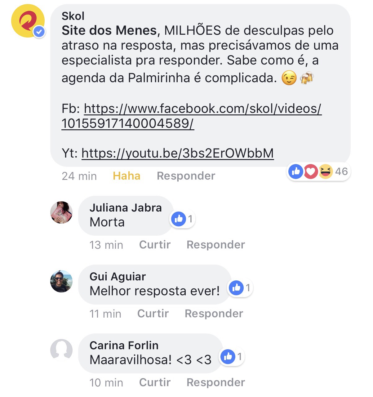 Para responder à brincadeira, a marca contou com a ajuda de Palmirinha. Em um vídeo encomendado pela Skol, a cozinheira comentou sobre a diferença entre a cerveja e o suco de milho, ensinando a receita e ameaçando quem misturar bebida com direção.